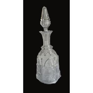 Bottiglia da liquore in vetro stampato-pressato, di stile neogotico, con decorazione ad arcate ogivali, con bellissimo tappo molato originale.