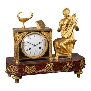 La composizione è impreziosita da una scultura allegorica di gusto neoclassico: una figura femminile seduta, finemente modellata, intenta a suonare uno strumento musicale, simbolo di armonia e arti. Ricchi dettagli ornamentali, tra cui elementi musicali e motivi decorativi applicati alla base, completano l’insieme con grande equilibrio estetico.