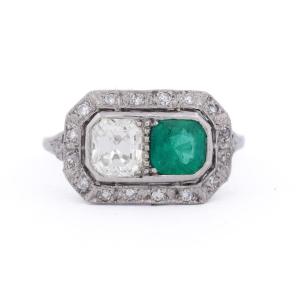 Al centro presenta un diamante taglio antico di circa 1 carato, colore G e purezza VS, affiancato da uno smeraldo naturale di circa 1 carato, creando un contrasto distintivo e di grande fascino.
