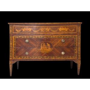 Cassettone lastronato in palissandro con intarsi in legni pregiati, sul fronte e sui fianchi scene mitologiche e piedi troncopiramidali.