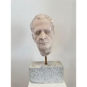 Scultura in gesso raffigurante un uomo del XX secolo. Italia. Questa scultura presenta il volto di un uomo dall'espressività intensa e ferma. Le rughe presenti sul suo volto, soprattutto nella zona della fronte e degli occhi, e le folte sopracciglia, donano alla rappresentazione una forte realisticità. L'opera è sostenuta da un'asta in ferro, fissata su di una base in pietra dalla texure grezza. Come notiamo dalle foto, le orecchie del soggetto presentano delle lievi mancanze.
