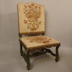 Poltrona da camino in legno laccato di colore verde con particolare tessuto d'epoca.