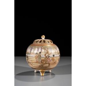 Koro giapponese in ceramica Satsuma di forma globulare, poggiante su tre piedi, decorato a tutto tondo con scene di vita quotidiana lungo una riva fluviale, animata da numerose figure e geishe. La composizione è arricchita da alberi di glicine in fiore, con rami ricadenti che si sviluppano nella parte superiore della decorazione.