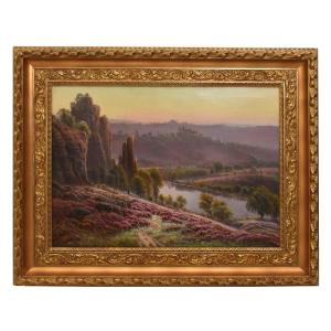 La categoria Quadri Antichi, Paesaggio Con Colline e Fiume, propone una Pittura Ad Olio Su Tela di epoca Primi del Novecento