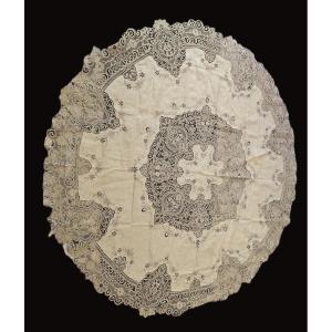 Tovaglia tonda e 6 tovaglioli degli anni '60 ricamati a mano con inserti a tombolo