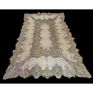 Tovaglia rettangolare in lino écru, finemente ricamata a mano e arricchita da inserti di merletto a tombolo. Mai utilizzata e mai lavata, conservata nel suo stato originale.