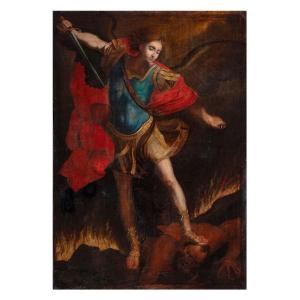 San Michele Arcangelo, cerchia di Guido Reni (1575-1642), secondo quarto del XVII secolo, olio su tela, senza cornice, prima tela, misure 143x100 cm.